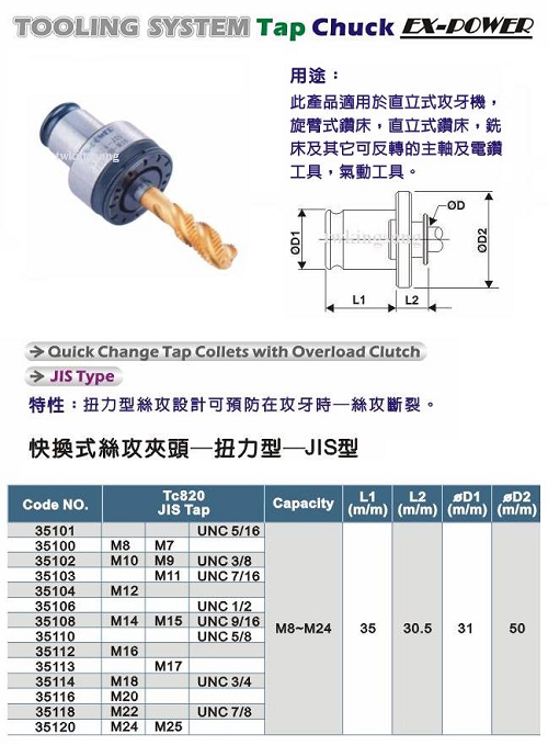 扭力保護型絲攻夾頭(可保護絲攻免於斷裂),適用於直立式攻牙機、旋臂式鑽床、直立式鑽床、铣床及其他可反轉的主軸及電鑽工具、氣動工具。