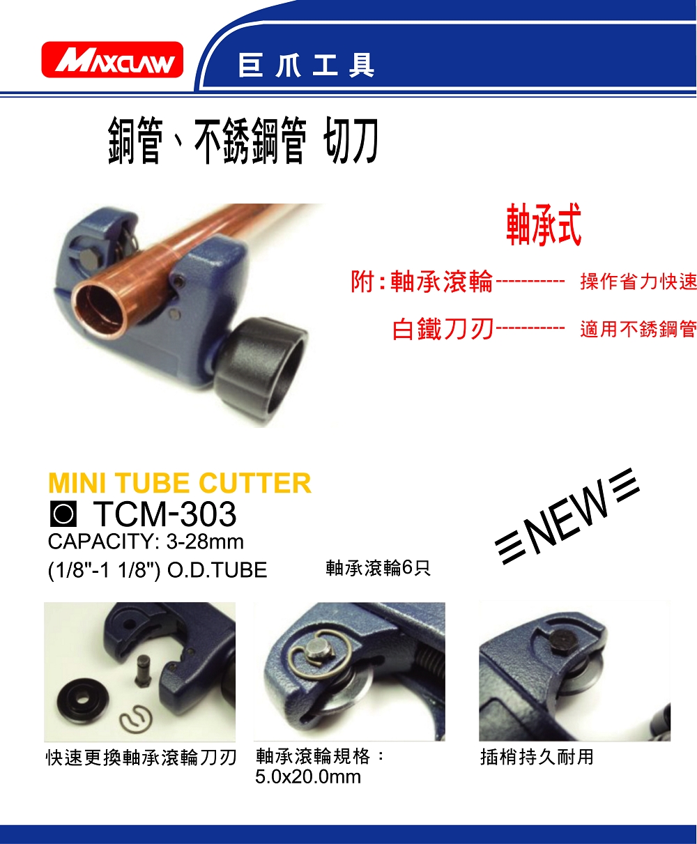 軸承式銅管切刀(適用不鏽鋼管),附軸承滾輪6只~操作省力快速。配白鐵刀刃。使用範圍:3~28mm