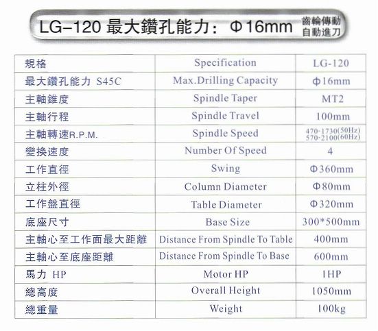 齒輪傳動自動進刀鑽孔機LG-120