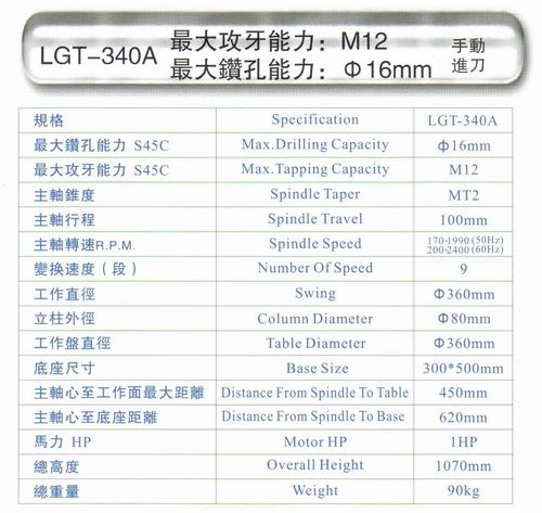 手動進刀電子鑽孔攻牙兩用機LGT-340A