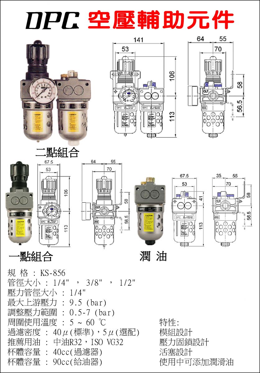 DPC 空壓輔助元件 特性: 模組設計。 壓力固鎖設計活塞設計。 使用中可添加潤滑油。 台灣製造。
