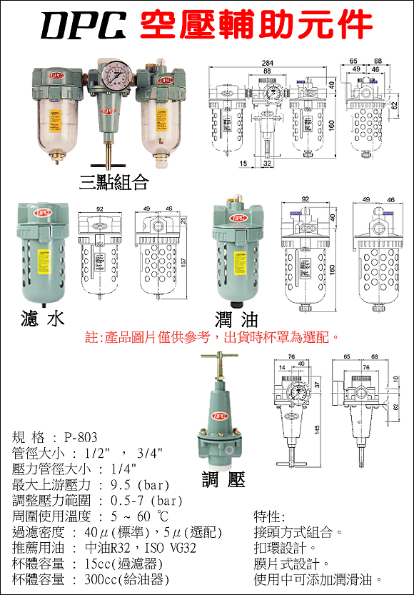 特性: 接頭方式組合。 扣環設計。膜片式設計。 使用中可添加潤滑油。 台灣製造。