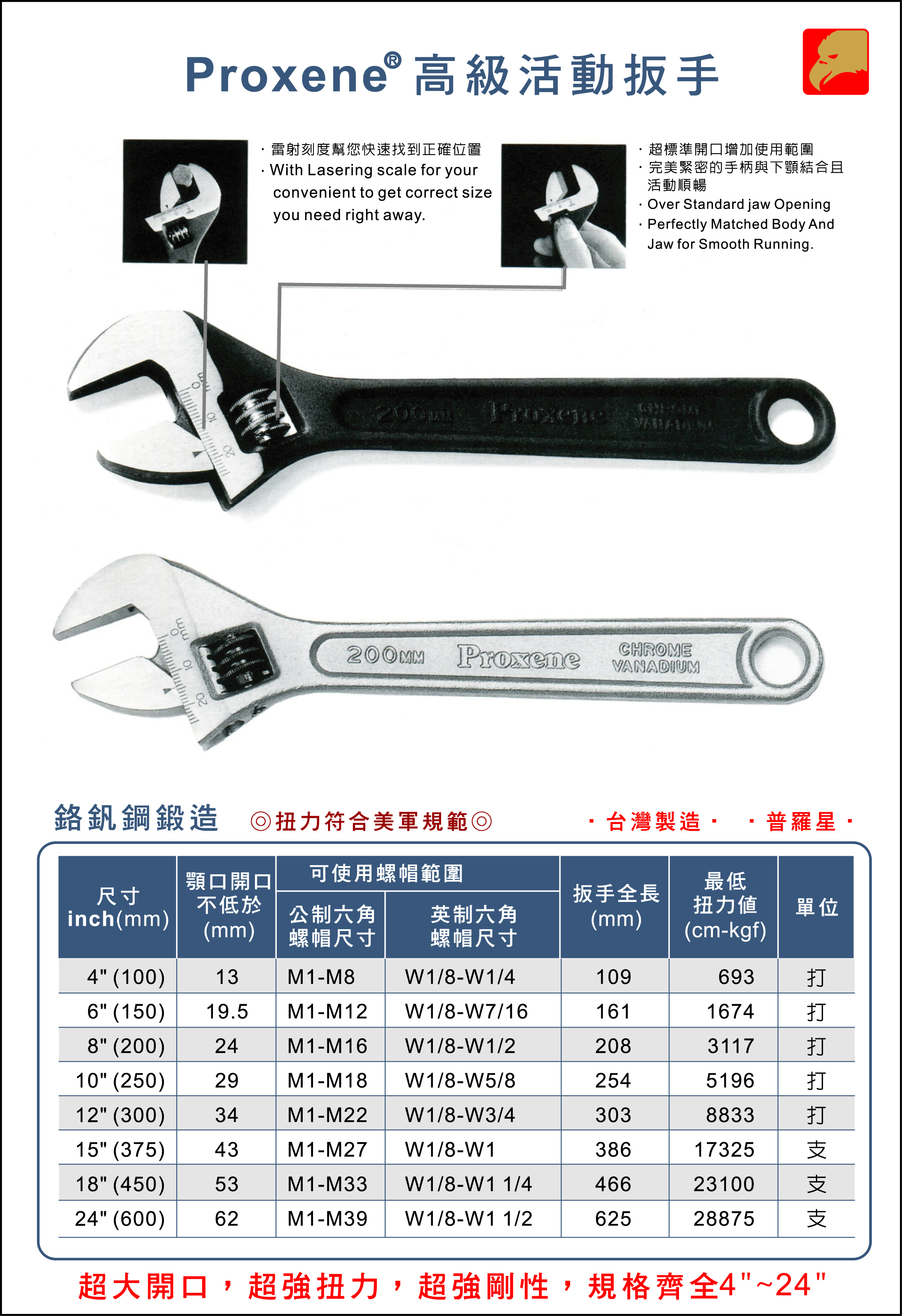 普羅星手工具:鉻釩鋼鍛造,超大開口,超強扭力,超強剛性,規格齊全4"∼24"( 符合美國軍規 ),雷射刻度幫你快速找到正確位置。超標準開口增加使用範圍,完美緊密的手柄與下顎結合且活動順暢。黑色手柄特殊防銹處理提高手柄防滑效果。‧台灣製造、品質保證‧
