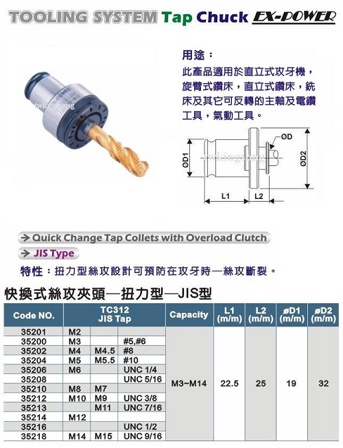 扭力保護型絲攻夾頭(可保護絲攻免於斷裂),適用於直立式攻牙機、旋臂式鑽床、直立式鑽床、铣床及其他可反轉的主軸及電鑽工具、氣動工具。