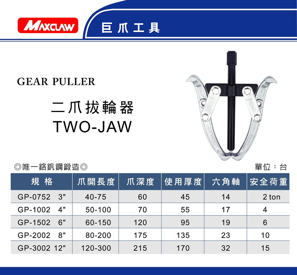 爪部採用鉻釩合金鋼材質,堅固、耐用。二爪拔輪器結構設計安全防滑,鉻釩合金鋼鍛造高強度勾爪提高經久耐用性能。螺桿採用滾壓熱處理,使其螺紋平滑可減輕機械摩擦力。拆卸效率高一人可方便操作。‧台灣製造、品質保證‧