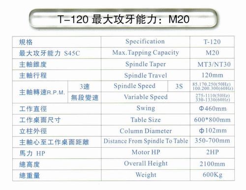 導螺桿傳動自動進刀攻牙機T-120